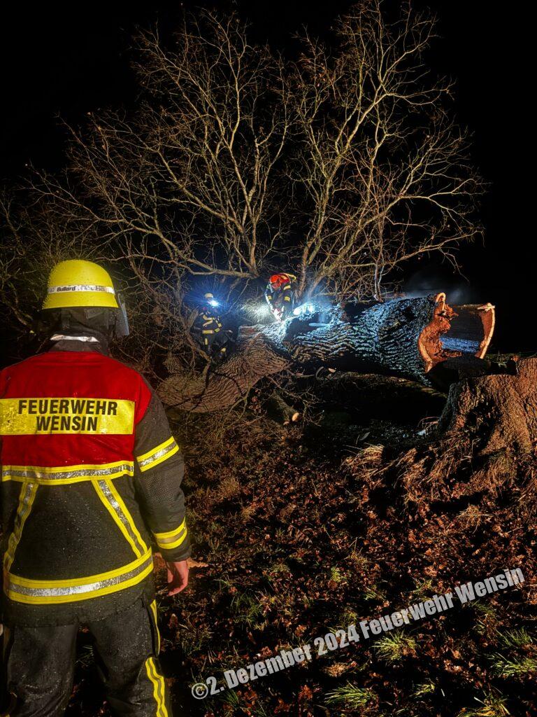 Die Alarmierung erfolgte aufgrund eines brennenden Baumes auf dem Golfplatz. Da wir uns zu dem Zeitpunkt mit einer Staffel im Feuerwehrhaus aufhielten, könnten wir zeitnah ausrücken. Vor Ort brannte ca. 300m von der Straße entfernt auf der Driving-Ranch eine ca. einen Meter dicke Eiche, dessen Stamm innen fast komplett hohl war. Nach erfolglosen Löschversuchen im Regen und immer wieder durch den Wind angefachten Feuer, wurde letztlich der Baum gefällt, sodass das Feuer gänzlich abgelöscht werden konnte.