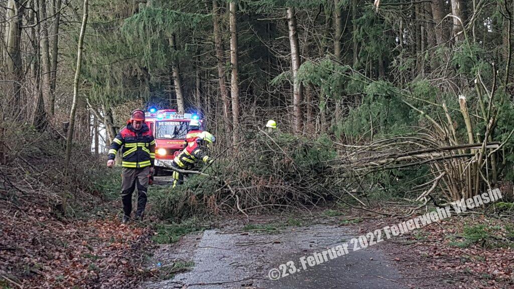 Im Blanken Diek Richtung Wegekaten sind im Wald mehrere Bäume durch den Sturm umgefallen. Ein Durchkommen war für Fahrzeuge nicht möglich. Die Feuerwehr beseitigte mit Kettensägen und Manpower diese, sodass eine Durchfahrt wieder möglich war.